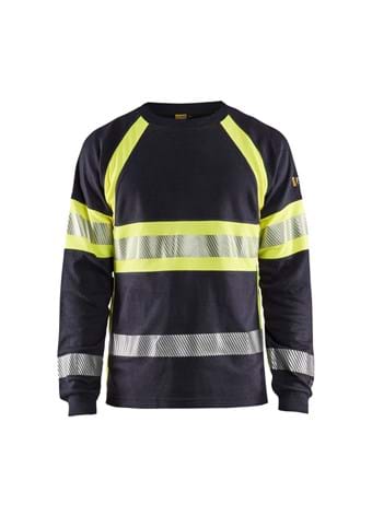 Langærmet flammehæmmende t-shirt i kraftig kvalitet med høj beskyttelsesværdi i high vis klasse 1. Den bløde og høje komfort i t-shirten bidrager til en fremragende komfort. Certificeret i henhold til EN 1149-5 og EN ISO 20471, klasse 1. EN ISO 11612 A1, B1, C1, E1, F1. IEC 61482-2, klasse 1. ATPV: 13,1 cal/cm².