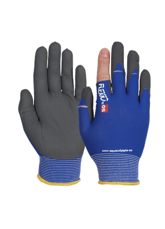 Tynd, sømløs og slidstærk handske af nylon/polyester/spandex med foam belægning af vandbaseret PU- og nitrilskum Aftagelige fingerspidser på alle fingre