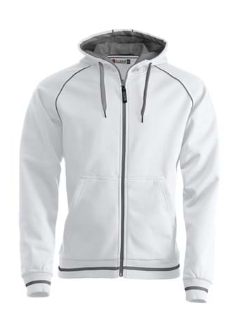 Hættetrøje med kæmmet inderside og strukturstrik udvendig. Der er kontrastfarve i hættens for, piping samt stribe på ribben og på lynlåsen foran.