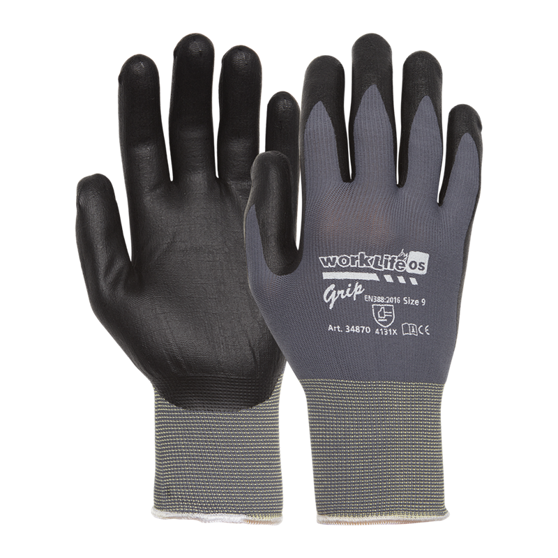 Tynd handske af nylon-lycra-strik med ribkrave og nitril-belægning i håndflade og på fingre.