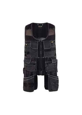 Moderne håndværker vest med mange praktiske lommer til værktøj og tilbehør. Aftagelig sømlommer og mavebælte for ergonomisk aflastning af skuldre og nakke. Vesten har dobbelt lynlås foran til at justere bredden, hvilket giver en bedre pasform og større komfort. Mesh paneler med stretch materiale gør vesten let og giver god ventilation.