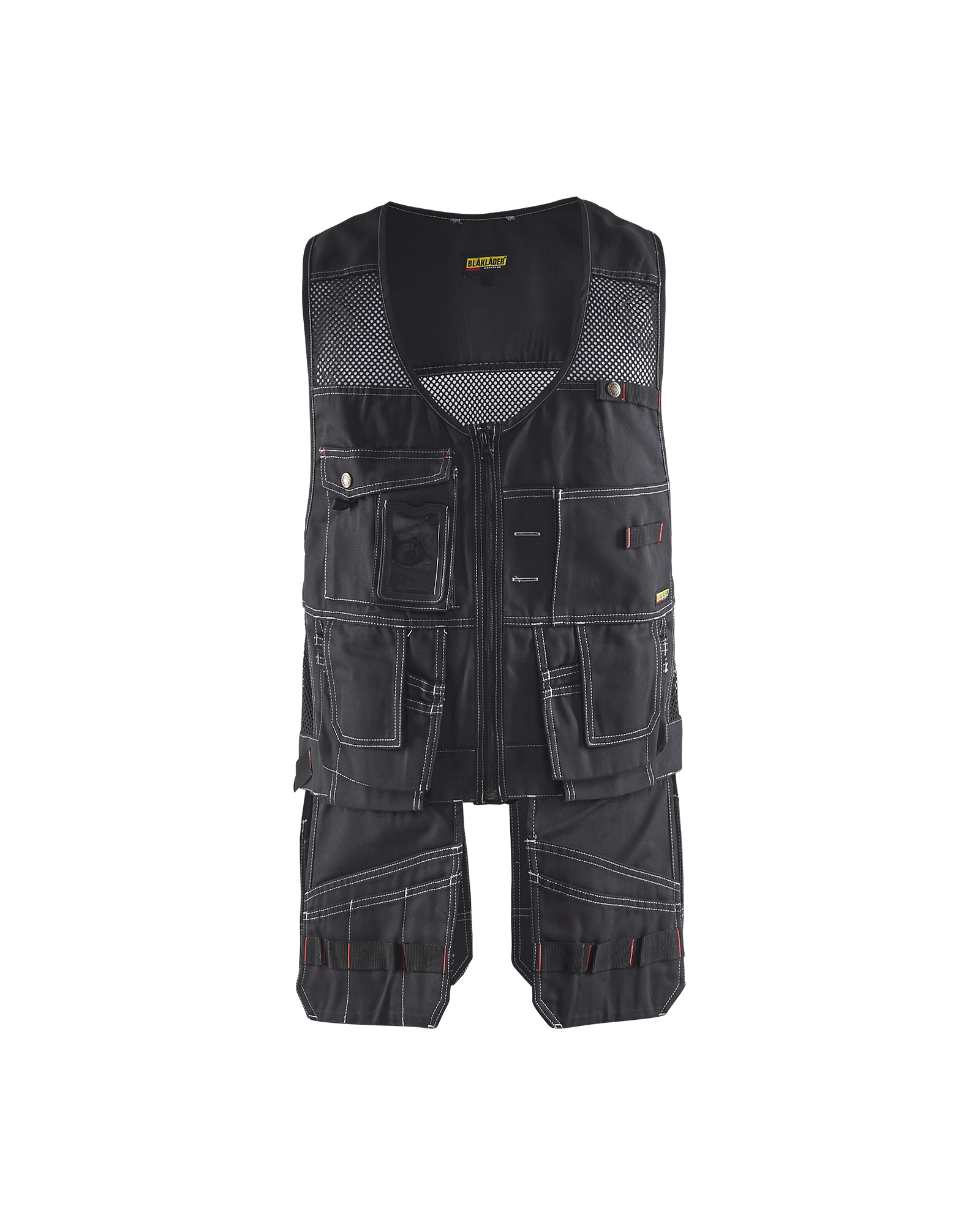 Fordel vægten på overkroppen med en slidstærk vest i polyester og bomuld eller i ren bomuld. Vesten har to brystlommer, en med lås og telefonlomme og en med blyantlomme. To forstærkede sømlommer og to mejsellommer med lås.