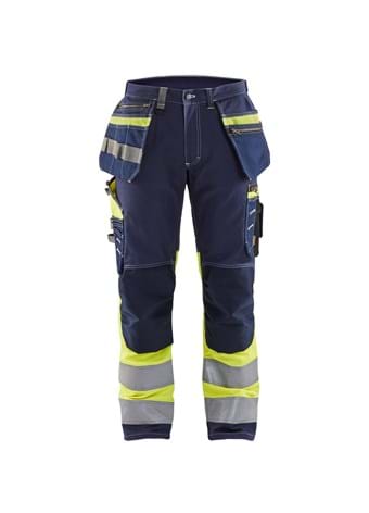 Slidstærke, komfortable og praktiske high vis bukser i 100% bomuld med reflekser. Bukserne, med en lidt smallere pasform, har et retrolook og kommer i enten marine blå med hvide kontrast syninger eller sort med grå kontrast syninger. For at gøre bukserne ekstra lette og komfortagle at have på, er der paneler af 4-vejs stretch på bagdelen. Har tommestoklomme, forlommer, let tilgængelig telefonlomme, sømlommer og baglommer forstærket med CORDURA®. Bukserne har også CORDURA® stretch forstærkede knælommer, alt sammen for en optimal komfort. Certificeret i henhold til EN ISO 20471 klasse 1.