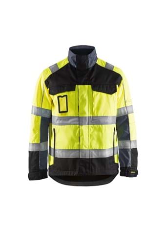 Praktisk jakke i vandafvisende materiale. Med formsyede ærmer, justerbar taljevidde og læg i ryggen. Farve 3399 gul/sort certificeret i henhold til EN ISO 20471 klasse 2.