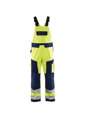 High Vis overall med knælommer og skrå lommer foran. Tommestoklomme og knivlomme. Modellen har en også en lårlomme med telefon- og blyantlomme, baglommer og hammerholder strop. Løse sømlommer sælges seperat - model 2183. 65 mm refleks. Certificeret i henhold til EN ISO 20471, klasse 2.