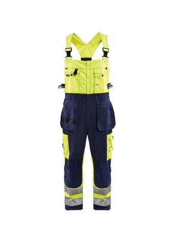 High Vis Helbuks med Cordura® forstærkede knæ og sømlommer for ekstra holdbarhed. Knælommer har mulighed for to placeringsniveauer. Helbuksen er udstyret med brede og fleksible seler. Smarte lommeløsninger og funktioner som hammerholder, tommestoklomme med kniv- og blyantlomme og D-ring. Baglommer med læg og sømlommer, der kan sættes i de forreste lommer.