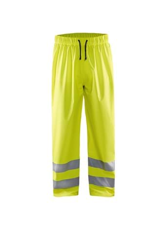 High Vis Regnbukser til dig med arbejdsopgaver, der kræver let og komfortabelt regntøj. Buksen er vind- og vandtæt med åndbarhed og svejsede sømme samt reflekser foran og bagpå. Den har en god pasform med elastisk talje og snøre i taljen samt justerbar benafslutning med knapper. Certificeret i henhold til EN 343, Klasse 3.1, beskyttelsesbeklædning mod dårligt vejr og EN ISO 20471, Klasse 2, beskyttelsesbeklædning med høj synlighed.