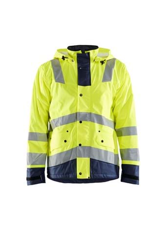 Denne LEVEL 2 Fleece foret high vis regn jakke giver dig mulighed for at udføre opgaver, der kræver holdbart og vandtæt tøj. 4307 er vind- og vandtæt med svejsede sømme. Jakken har en aftagelig, justerbar hætte og en blød fleeceforet krave. Den er udstyret med let tilgængelige lommer, som f.eks. aftagelig ID-kortlomme, frontlommer med klap og trykknap samt napoleonslomme. Skjult stærk to-vejs lynlås, der kan lynes helt op til kraven og frontluk med trykknapper. God pasform med justerbar linning med snøre. Certificeret i henhold til EN 343, klasse 3,1. EN ISO 20471, klasse 3.