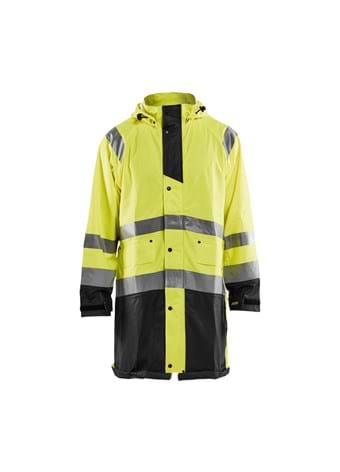 High Vis Regnjakke til dig med arbejdsopgaver, der kræver let og fleksibelt regntøj. Jakken er vind- og vandtæt med svejsede sømme samt aftagelig justerbar hætte. Jakken har en skjult tovejs lynlås og snøre i kraven samt knaplukning. God pasform med justerbar ærmer med velcro. Let tilgængelig frontlommer med klap og opknappelig drypkant. Certificeret i henhold til EN 343, Klasse 3.1, beskyttelsesbeklædning mod dårligt vejr og EN ISO 20471, Klasse 3, beskyttelsesbeklædning med høj synlighed.