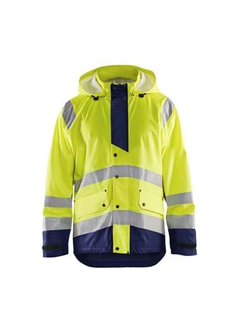 Styrke, fleksibilitet og ekstremt gode beskyttelsesfunktioner karakteriserer denne high vis regnjakke, der er særligt velegnet til folk, der ofte arbejder udenfor i våde forhold og dårligt vejr. Den er vind- og vandtæt i stærkt materiale med svejsede sømme, og har en skjult lynlås med stormklap, der er effektiv til at holde regn væk fra kroppen. Den fleece forede krave giver beskyttelse og varme uden at skave. Justerbare ærmer med indvendige neopren manchetter for at forhindre vandet i at sive ind, mens du arbejder. Certificeret i henhold til EN 343, klasse 3.1, beskyttelsestøj mod dårligt vejr og EN ISO 20471, klasse 3, beskyttelsesbeklædning med høj synlighed.