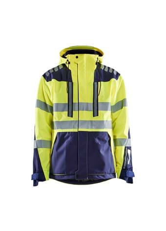 High vis skaljakke i et lamineret, elastisk ripstop materiale med fremragende rivstyrke. Jakken har tapede sømme, ærmer med forstærkede manchetter og omhyggeligt placerede reflekser, der sammen med fluorescerende materiale gør dig synlig fra alle retninger. ID-kortlomme på venstre ærme. Jakken har en tovejs lynlås, dobbelt frontklap, stor napoleonslomme med plads til en tablet, frontlomme med læg og to åbninger, hvoraf den ene har lynlås samt brystlommer med lynlåse. Indre mesh lomme, stor inderlomme med lycra, og indvendig mobillomme med lynlås og åbning til et headset. Den aftagelige hætte er foret og kan justeres i tre forskellige niveauer. Indersiden af jakken har en børstet fleksibel meshforing optimal komfort og bevægelsesfrihed. Certificeret i henhold til EN ISO 20471 Klasse 3, EN 343, Klasse 3,3.