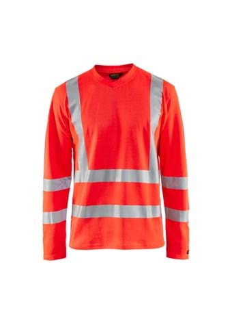 8948-1070-5500Langærmet High Vis T-shirt med v-hals i et blødt materiale. En fantastisk t-shirt, der er dejlig og komfortabel at arbejde i. T-shirten beskytter mod UV-stråling og har en solcreme faktor på 40+. Reflekser er trykt på. Certificeret i henhold til EN ISO 20471, klasse 3, beskyttelsesbeklædning med høj synlighed og EN 13758-2 UPF 40+ sol UV-beskyttende egenskaber.