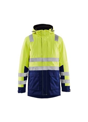 En varm vinter parka til hårde arbejdsmiljøer, hvor det er vigtigt at være synlig. Den er fremstillet i et stærkt vind- og vandtæt materiale med tapede sømme og en varm quiltet foring, der er behagelig og beskytter mod kulde og vind. Den har slidstærkt yderstof med mørke kontrast farver, hvor jakken er mest udsat for snavs. Parka jakken har en tovejs lynlås foran og formsyede ærmer for bedre komfort. Taljen kan justeres med snøre på bagsiden for bedre pasform. Reflekserne er påvarmet for øget fleksibilitet, og hætten har trykknapper, der let kan åbnes og lukkes. Certificeret i henhold til EN 342 kombineret med 1885, EN 343 klasse 3.1, EN ISO 20471 Klasse 3, beskyttelsesbeklædning med høj synlighed.