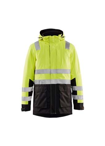 En varm vinter parka til hårde arbejdsmiljøer, hvor det er vigtigt at være synlig. Den er fremstillet i et stærkt vind- og vandtæt materiale med tapede sømme og en varm quiltet foring, der er behagelig og beskytter mod kulde og vind. Den har slidstærkt yderstof med mørke kontrast farver, hvor jakken er mest udsat for snavs. Parka jakken har en tovejs lynlås foran og formsyede ærmer for bedre komfort. Taljen kan justeres med snøre på bagsiden for bedre pasform. Reflekserne er påvarmet for øget fleksibilitet, og hætten har trykknapper, der let kan åbnes og lukkes. Certificeret i henhold til EN 342 kombineret med 1885, EN 343 klasse 3.1, EN ISO 20471 Klasse 3, beskyttelsesbeklædning med høj synlighed.