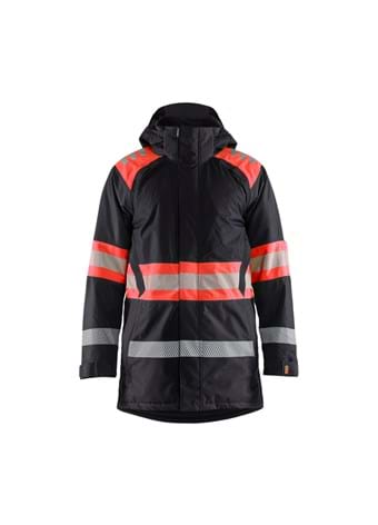 High Vis vinterparka der med sit design og quiltet for, holder dig varm og hjælper dig, når du er på arbejde. Parkaen er vind- og vandtæt med tapede sømme, og hætten er aftagelig og tilpasset til hjelme og høreværn. Justerbar i taljen for individuel komfort, med lynlås i siderne for adgang til inderlommerne uden at åbne fronten og blive kold. Certificeret i henhold til EN ISO 20471 Klasse 1. Samcertificeringsgruppe D.
