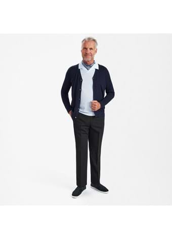 Flotte og elegante bukser med elastik i taljen. Bukserne er i en pæn uldkvaliet og har ingen knapper eller lynlås. Dette gør bukserne behagelige og utrolig nemme både at tage af og på. Bukserne er velegnede til ældre mænd, men også personer med gigt, stomi eller kørestolsbrugere. Den behagelige metervare beholder sit glatte og nypressede udseende selv efter mange timers brug. Bukserne findes i farverne sort, mørkegrå og mørkeblå.