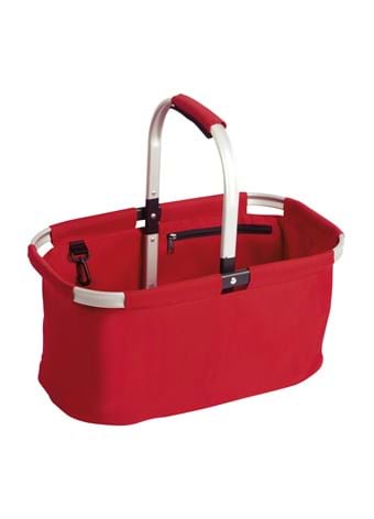 Sammenklappelig indkøbskurv med aluminiumsramme. Flot design og nem at folde sammen. Indvendig lynlåslomme og plastikkrog til nøgler m.m. SBS-lynlås. 46 x 28 cm / Højde: 24 cm