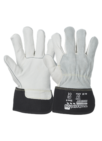 Natur oksehudshandske med overhånd i spalt. Syet med kevlar tråd. Foret med bomulds-jersey.