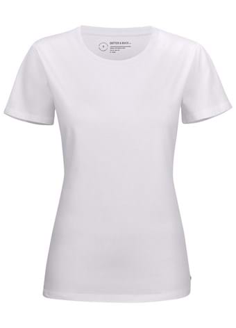 Stretchy blød klassisk rundhals t-shirt til daglig brug. Moderne pasform og dekoreret med en lille metalskilt på forsiden.