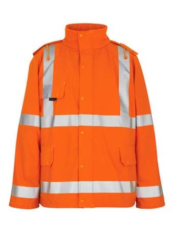 Vindtæt og vandtæt.; Det vandtætte materiale har svejsede sømme, så regnen ikke kan komme ind.; Ekstra synlig for omgivelserne ved hjælp af både lodrette og vandrette reflekser.; Hætte kan foldes ind i kraven og har regulerbar elastiksnøre.; Ventilation i ryggen.