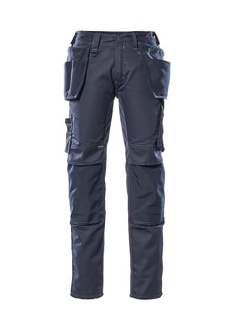 Slidstærke trenålssømme på ben og i skridt forlænger produktets levetid.; Den lave talje med formskåret linning sikrer, at bukserne følger og støtter alle kroppens bevægelser.; Hængelommer i CORDURA® er regulerbare og med ekstra lommer til værktøj.; Telefonlomme integreret i højre forlomme.; Knælommer af slidstærk CORDURA® - med indstik af knæpude fra oven og med overfald, så de ikke samler snavs.; Samcertificeret til brug med MASCOT knæpudetype SHORT eller LONG, da knæpudelommen kan højdejusteres.