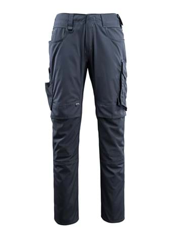 Slidstærke trenålssømme på ben og i skridt forlænger produktets levetid.; Den lave talje med formskåret linning sikrer, at bukserne følger og støtter alle kroppens bevægelser.; Super pasform med formskårede ben og kile på indersiden af ben og i skridt (med ekstra forstærkning).; Knælommer af slidstærk CORDURA® - med indstik af knæpude fra oven og med overfald, så de ikke samler snavs.; Ekstra synlig for omgivelserne ved hjælp af reflekseffekter.; Samcertificeret til brug med MASCOT knæpudetype SHORT eller LONG, da knæpudelommen kan højdejusteres.