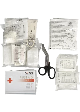 346.51OX-ON First Aid Pro refill bag Comfort er en sortimentspose til genopfyldning af OX-ON First Aid Pro Box Comfort (346.50). Posen indeholder alle de elementer, som findes i førstehjælpskufferten, så du er sikker på altid at have alle de vigtige førstehjælpsremedier ved hånden. Sortimentsposen efterlever DIN 13157 standard. Genopfyldningssættet Indeholder: 1 stk taperulle 2,5 cm x 5 m. 1 sæt elastisk plaster 10 cm x 6 cm (8 stk.) 4 stk plaster 4 x 6,5 cm 4 stk plaster 1,9 x 7,2 cm 8 stk plaster 2,5 x 7,2 cm 4 stk plaster 2 x 12 cm 1 stk gazekompres 6 x 8 cm 3 stk gazekompres 8 x 10 cm 3 pk gazekompres 10 x 10 cm (2 stk. pr. pk.) 1 stk gazekompres 10 x 12 cm 1 stk gazebind 60 x 80 cm 2 stk øjenkompres 5,5 x 7,5 cm 1 stk ispose 1 stk alu-tæppe 160 x 210 cm 2 stk elastisk bandage 6 x 400 cm 2 stk elastisk bandage 8 x 400 cm 2 stk armklæde 96 x 96 x 136 cm 1 stk saks 2 stk plastposer m. lynlås 5 stk servietter 20 x 30 cm 4 stk engangshandsker 1 stk førstehjælpsvejledning