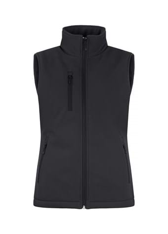 En polstret softshell vest, med tre udvendige lommer med omvendte SBS-lynlåse og en inderlomme. Sort foring, broderi, lynlås og en let aftagelig nakkelabel for ommærkning.
