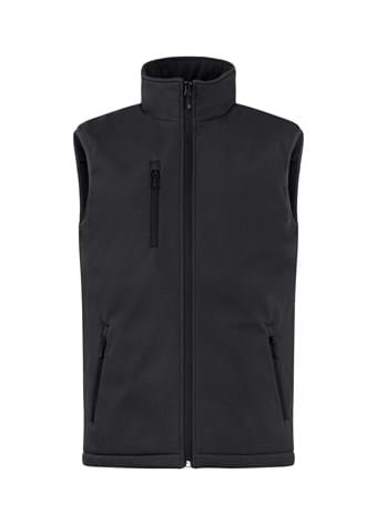 En polstret softshell vest, med tre udvendige lommer med omvendte SBS-lynlåse og en inderlomme. Sort foring, broderi, lynlås og en let aftagelig nakkelabel for ommærkning.