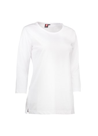 Ekstra slidstærk T-shirt med 3/4 ærmer, rund hals og slids i siden. T-shirten har gennemgået en forkrympningsproces ved meget høje temperaturer, både før og efter indfarvningen, for ekstra stabilitet og lang levetid. Let figursyet.