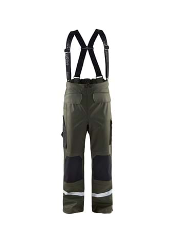 Regnbukser til dig med arbejdsopgaver, der kræver slidstærkt og fleksibelt regntøj. Bukserne er vind- og vandtætte med svejsede sømme. God pasform med bred elastik på bagsiden, justerbare og aftagelige elastik seler og justerbare benafslutning med knapper. Let tilgængelige lommer som lårlomme med læg og klap, tommestoklomme med ekstra lomme og knivholder og åbning med klap for brug af sømlommer. Bukserne er forstærket på knæ og nederste del af bukseben. Certificeret i henhold til EN 343, klasse 3.1, beskyttelsesbeklædning mod dårligt vejr.
