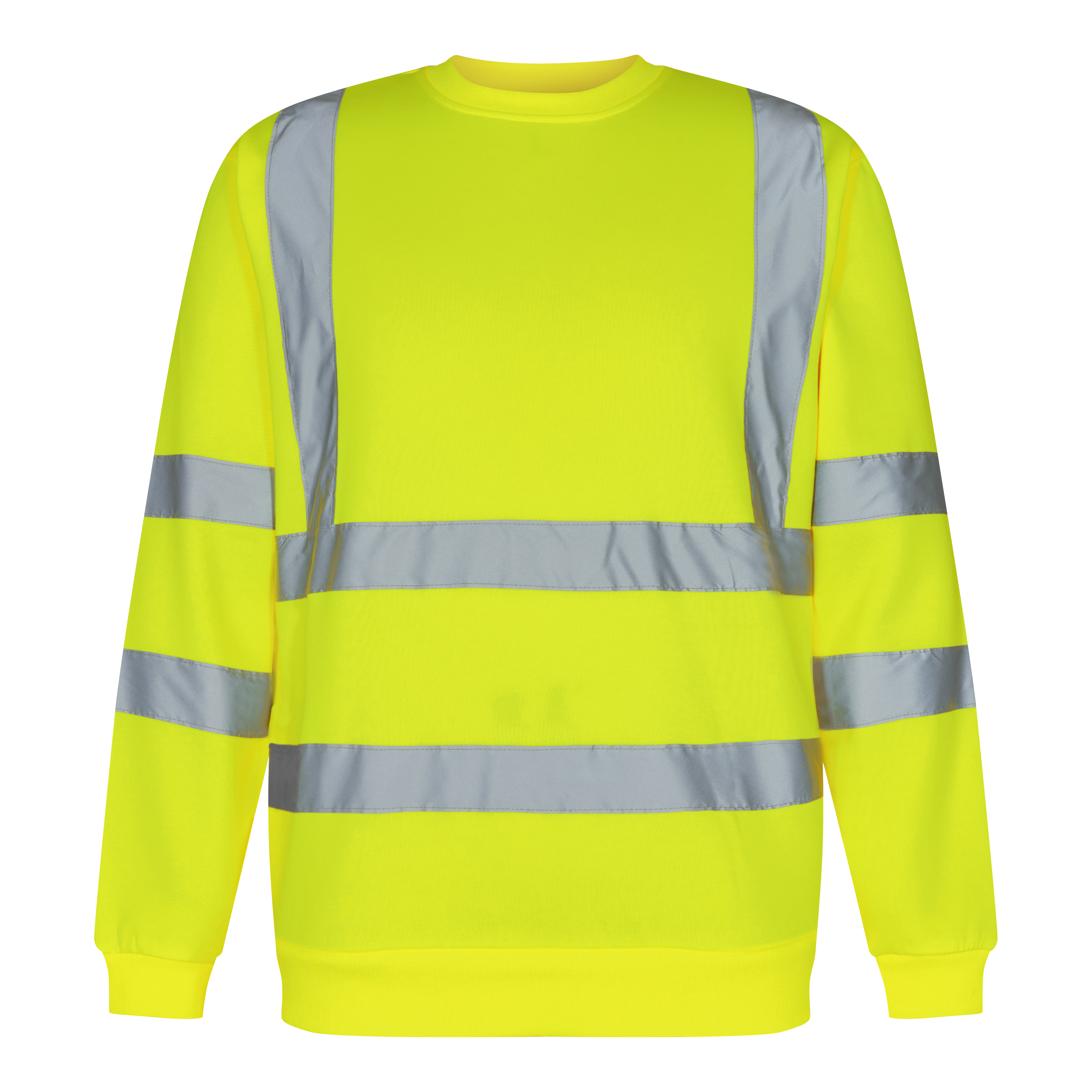 Funktionel og lækker fluorescerende sweatshirt. Børstet inderside som gør den blød og behagelig. Rib i hals, ærmer og bund. Påsyede reflekser over skuldre samt omkring ærmer og liv. Beklædningsklasse 2. Testet efter 25 vaske.