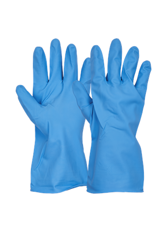 Glat latex handske med indvendig bomulds- velourisering. Handsken har gribemønster i håndfladen samt rullet kant. Længde ca. 30 cm.