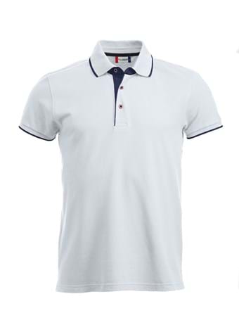 Polo med farvekontrast i knapper, nakketape, stolpelukning og slids i siden. Stolpelukning med 3 knapper. Kontrast stribe på krave og ærmeender.
