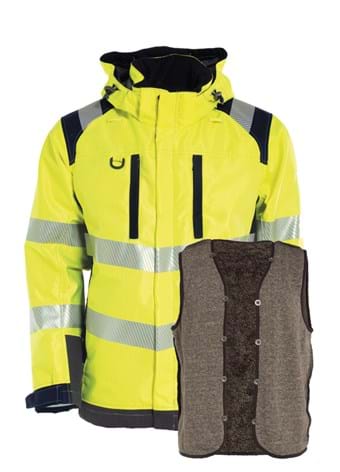 Metalfri og inherent Flammehæmmende skaljakke med tapede sømme og meshforing. Leveres med ærmeløst pilefoer 9128 06. Vind- og vandtæt iht. EN 343. Jakken er ergonomisk designet for arbejde med løftede arme. Skjult lynlås og dobbelt vindfang med trykknapper. Justerbar og aftagelig hætte. To stropper til kommunikationsudstyr. Brystlommer med lynlås. D-ring. To inderlommer med lynlås, én til dokumenter/ipad med en integreret telefonlomme. Indvendig holder til headset. Sidelommer med lynlås. Justerbar ærmeslut og indvendig rib. Løbegang forneden. HTFR Dobby forneden og på ærmer. Påvarmede reflekser for bedre komfort. Pilefoer 9128. *Jakken har en kombineret certificering og opnår EN ISO 20471 CL.3 sammen med Tranemo buks eller overall der er certificeret i henhold til EN ISO 20471 CL.1 eller CL.2. **Hætte skal anvendes eller fjernes under svejsning eller arbejde med kemikalier.