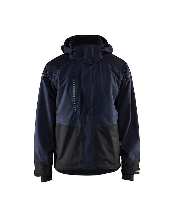 - 100% polyester, twill, mekanisk stretch, lamineret, vandtæt 11.000 mm, vindtæt, åndbarhed 4.000 g/m²/24H, Ret 8,5, 150 g/m²