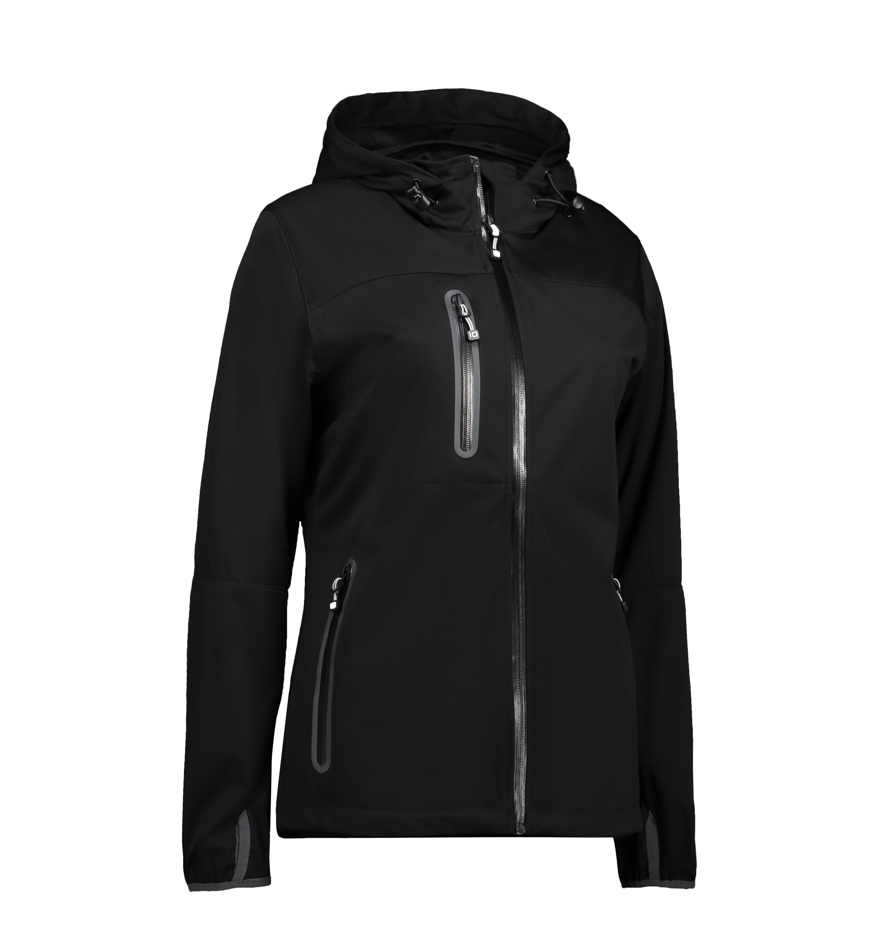0876Funktionel softshell letvægts-jakke med hætte og smarte kontraster. Trelags ID® Tech kvalitet med strikket overflade der giver en blød og strækbar kvalitet. Smarte lommer uden syninger. Funktionel membran med vind- og vandafvisende egenskaber. Let figursyet.