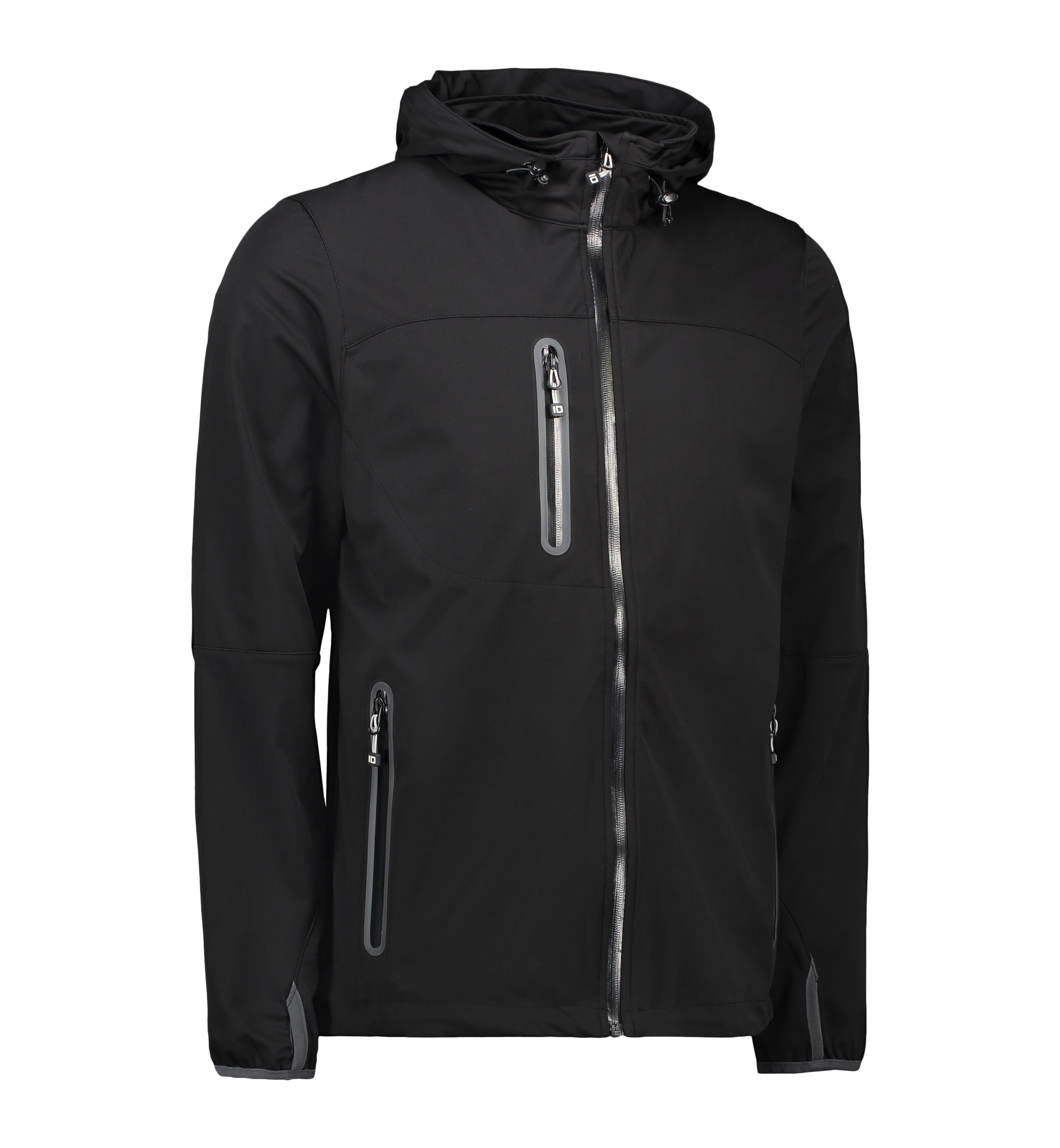 0875Funktionel softshell letvægts-jakke med hætte og smarte kontraster. Trelags ID® Tech kvalitet med strikket overflade der giver en blød og strækbar kvalitet. Smarte lommer uden syninger. Funktionel membran med vind- og vandafvisende egenskaber. Tætsiddende model.