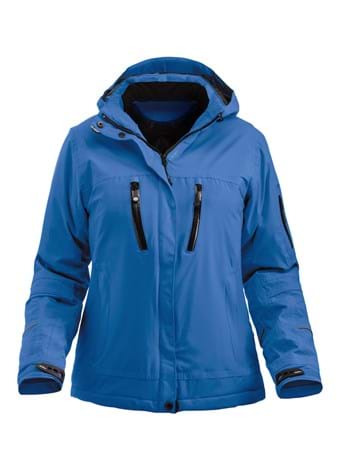 Foret dame softshell jakke med aftagelig hætte og snefang. Forbøjede ærmer og skjult manchet nederst på ærmerne. Inderlomme og refleks pipings. W/P 5000, MVP 5000.