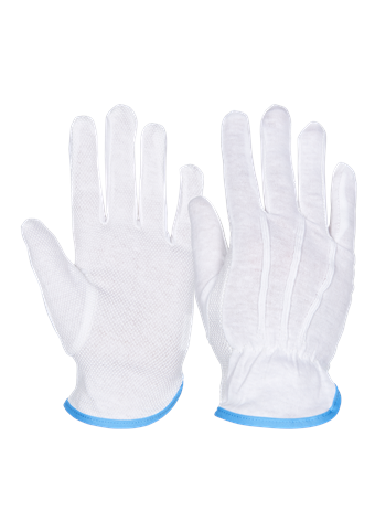 Strålesyet, hvid bomuldsinterlock handske. Slip-on model med pvc-dotter i håndfladen og på undersiden af fingre. 12 par.