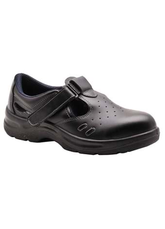 FW01-BKRS1 Sikkerhedssandal med ståltånæse og en perforeret overdel for ekstra ventilering under varme arbejdsforhold. Detaljer inkluderer burrebånd-lukning for en bedre pasform.