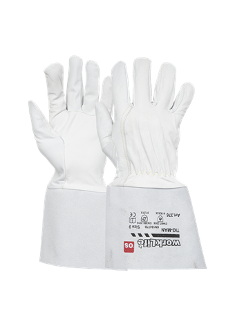 376Tynd svejsehandske af natur skind med indsyet elastik i overhånden. Handsken har en spalt krave på 12 cm. Syet med kevlartråd.