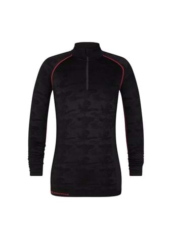 Uld undertrøje med høj hals og lynlås i sømløst materiale for øget komfort. Materialet indeholder en del merinould og har en høj isoleringsevne hvilket gør undertrøjen særlig anvendelig under kolde vejrforhold. Metervaren er blød og behagelig samt åndbar og svedabsorberende