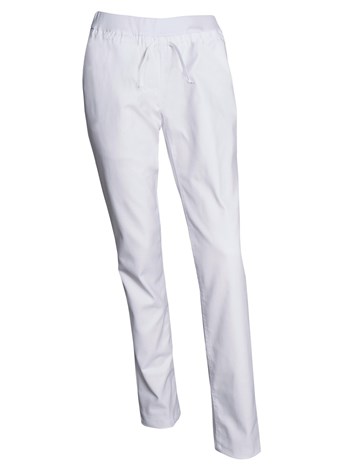 Disse stretch pull-on jeans med bred rib, elastik og snøre i taljen, giver optimal pasform og plads til bevægelse til både kvinder og mænd, der foretrækker et casual fit med slankende hofte og lår. Den specialdesignet rib-linning og low-cut taljehøjde, giver et rent og moderne udseende. Smal benåbning tilføjer et ungt og afslappet look. Findes kun i hvid. 245 g/m².