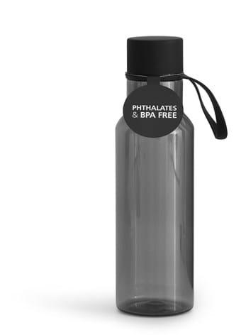 Stilfuld og praktisk vandflaske af BPA-fri tritanplast. Låget er af rustfrit stål, der er dækket af sort gummi, hvilket giver et godt greb ved åbning. Løkken gør det muligt at hænge flasken på eksempelvis træningstasken. Du kan få denne flaske til at se endnu bedre ud ved at printe eget logo!