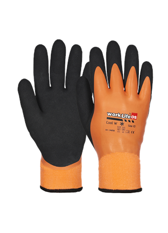 Dobbeltforet vinterhandske i polyester med indvendig for af akrylfrotté. Handsken har dobbelt-belægning af orange latex heldyp samt sort halvdyppet foam-belægning med sandy overflade, inkl. tommelfinger. Sømløs handske med ribkrave. Kategori II godkendt.