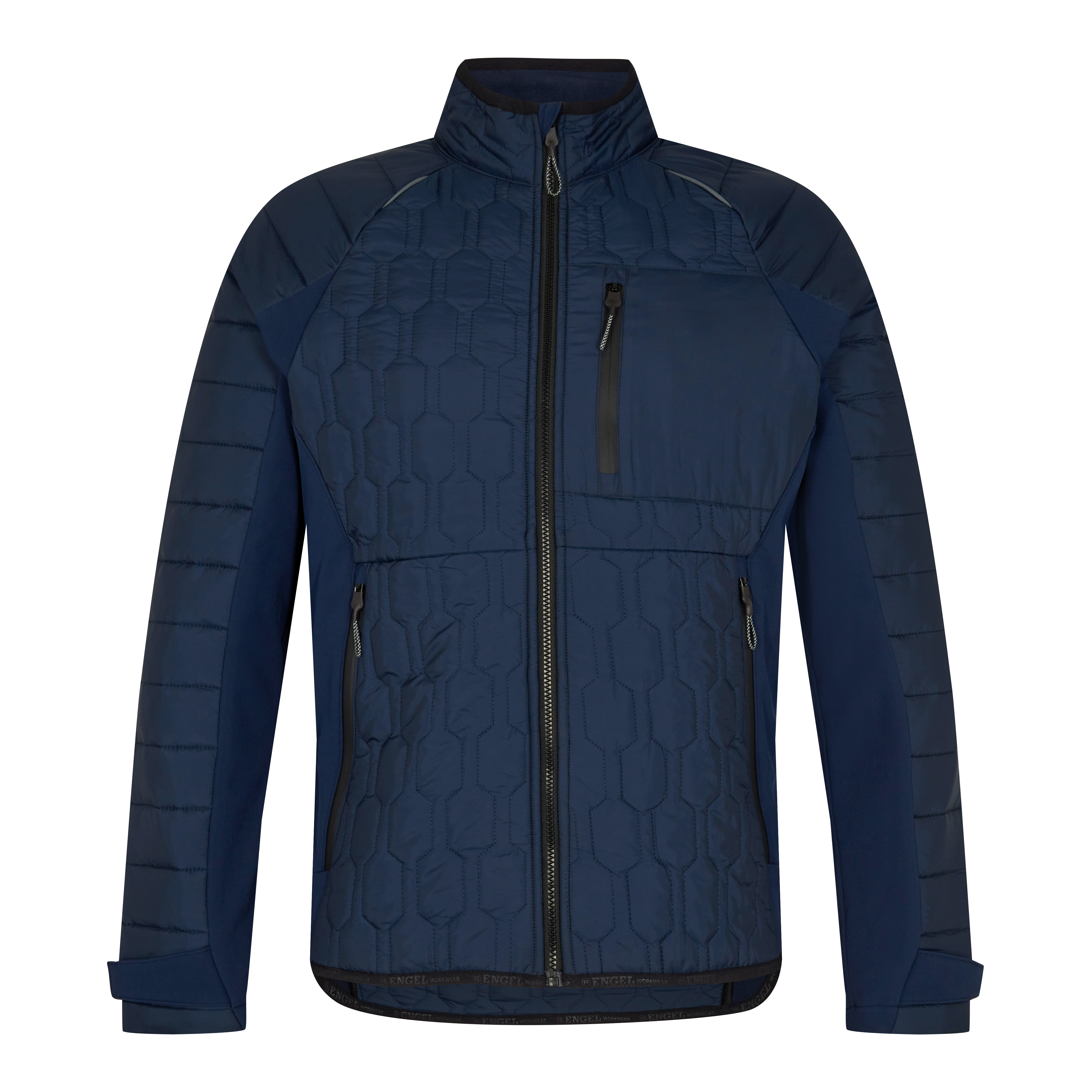 Let quiltet jakke der er kombineret med softshell. Jakken kan kombineres med model 1373-611 som har zip-in detalje. To sidelommer samt brystlomme lukket med lynlås. 2 indvendige lommer lukket med velcro. På brystlomme er der mulighed for firmaprofilering. Jakken har elastisk kantbånd i bunden samt i kraven. Regulerbare ærmer. I ærmerne er der et ekstra vindfang i et elastisk materiale. Vindfanget har hul til tommelfingeren og kan trækkes ud over hånden for at beskytte yderligere mod kulde. Reflekspipings for øget synlighed.